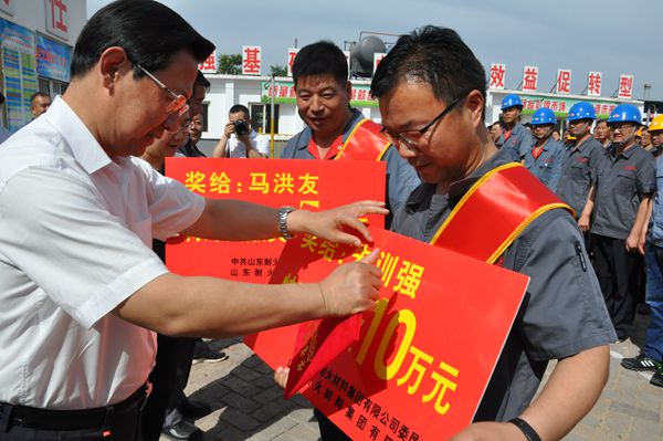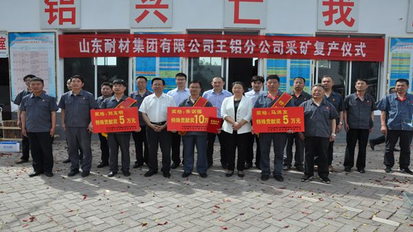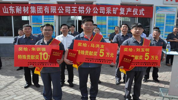 - 復(fù)產(chǎn)儀式由王鋁分公司經(jīng)理汪繼爐主持。山東耐材集團(tuán)公司總經(jīng)理李文亮宣讀了表彰決定,對(duì)為采礦復(fù)產(chǎn)做出特殊貢獻(xiàn)的朱訓(xùn)強(qiáng)、馬洪友、劉玉明三名同志予以表彰,給予朱訓(xùn)強(qiáng)一次性獎(jiǎng)勵(lì)10萬(wàn)元,給予馬洪友、劉玉明一次性獎(jiǎng)勵(lì)各5萬(wàn)元,并現(xiàn)場(chǎng)為三位受表彰人員頒獎(jiǎng)。